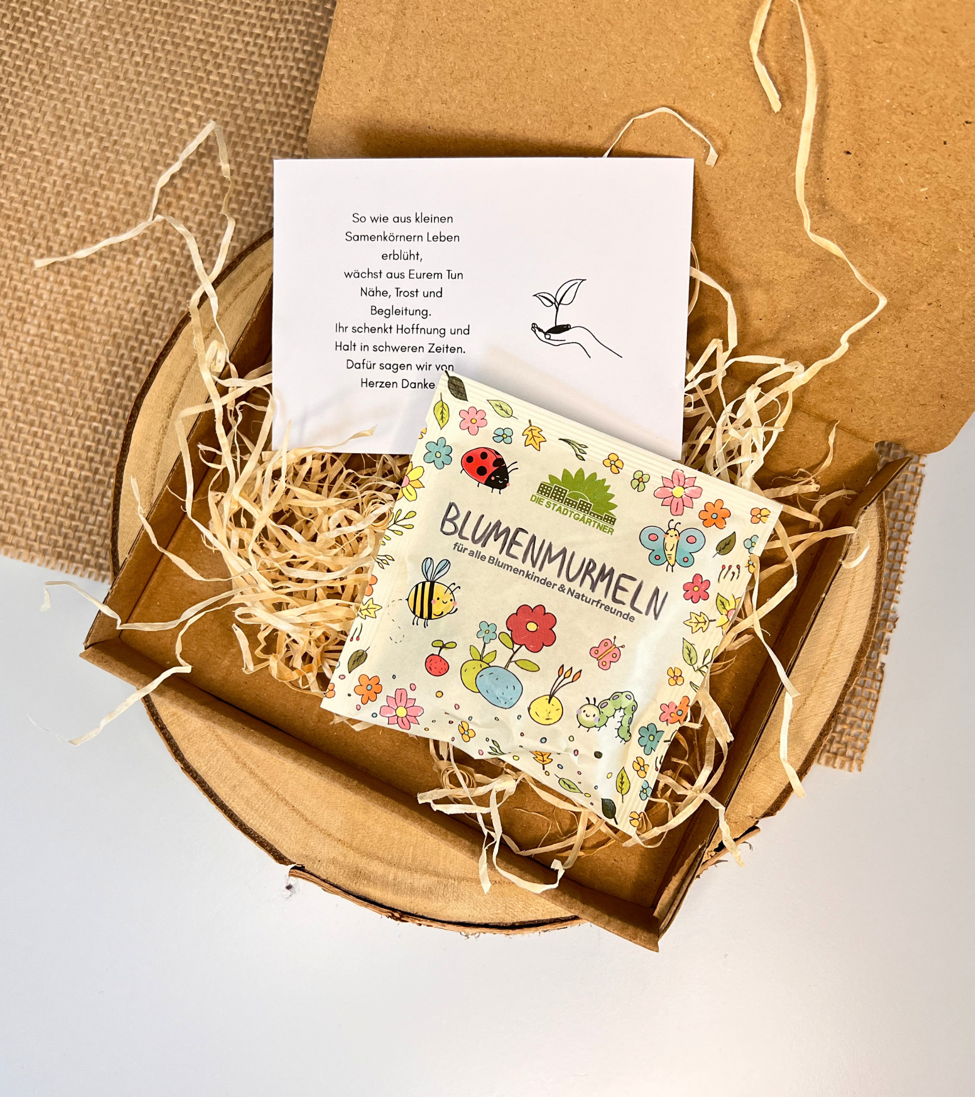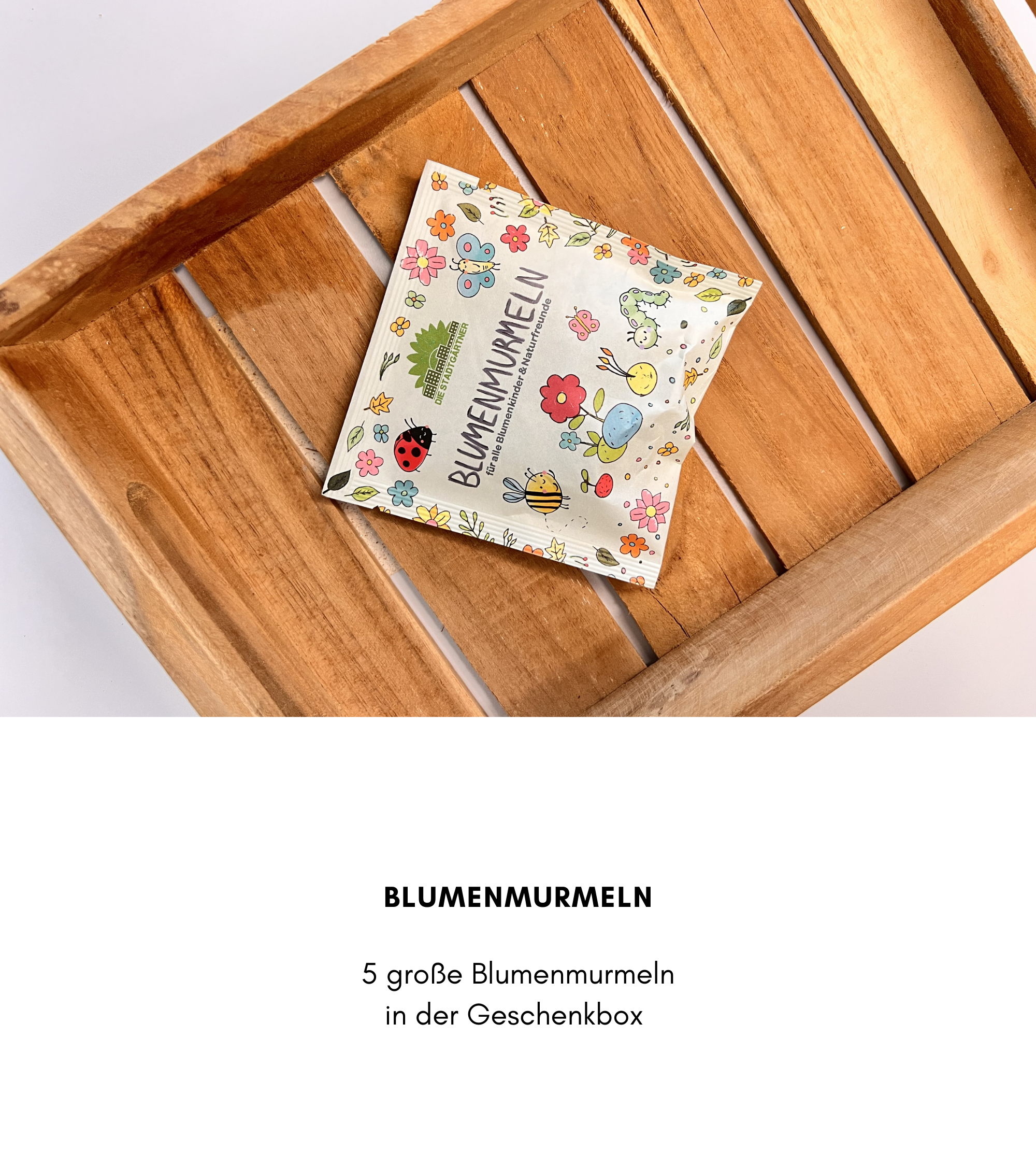 Nachhaltig hergestellt, liebevoll verpackt und perfekt geeignet für Feste (Weihnachten, Geburtstag), Jubiläen oder Aktionstage – diese Blumenmurmeln schenken Natur, Farbe und Hoffnung.
