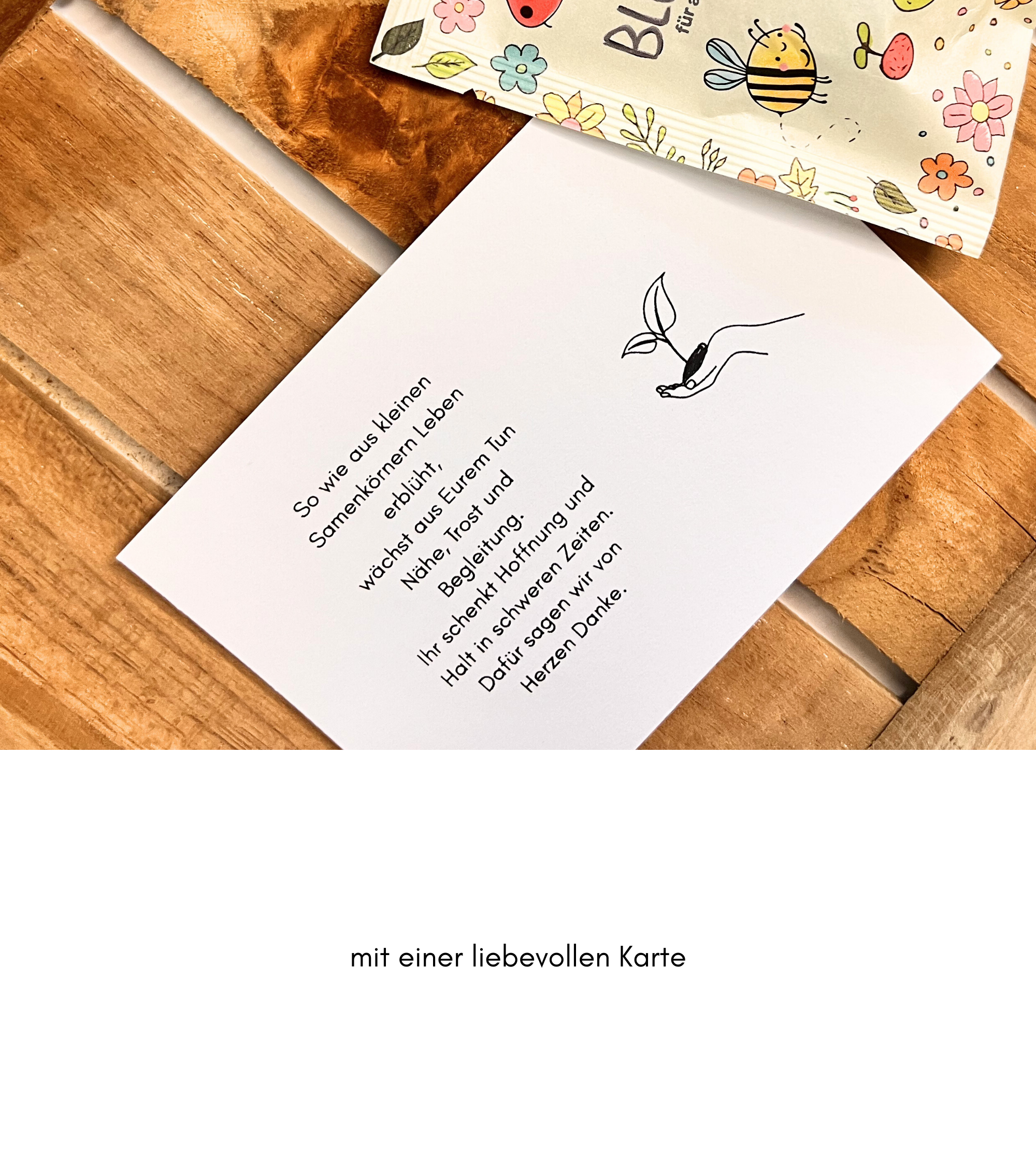 Ideal als Dankeschön-Geschenk für Mitarbeitende, Ehrenamtliche oder Angehörige in Hospizen, Pflegeeinrichtungen oder sozialen Organisationen. Einfach auf die Erde legen, leicht andrücken, regelmäßig gießen – und bald entfaltet sich ein kleines Blütenmeer voller Freude.