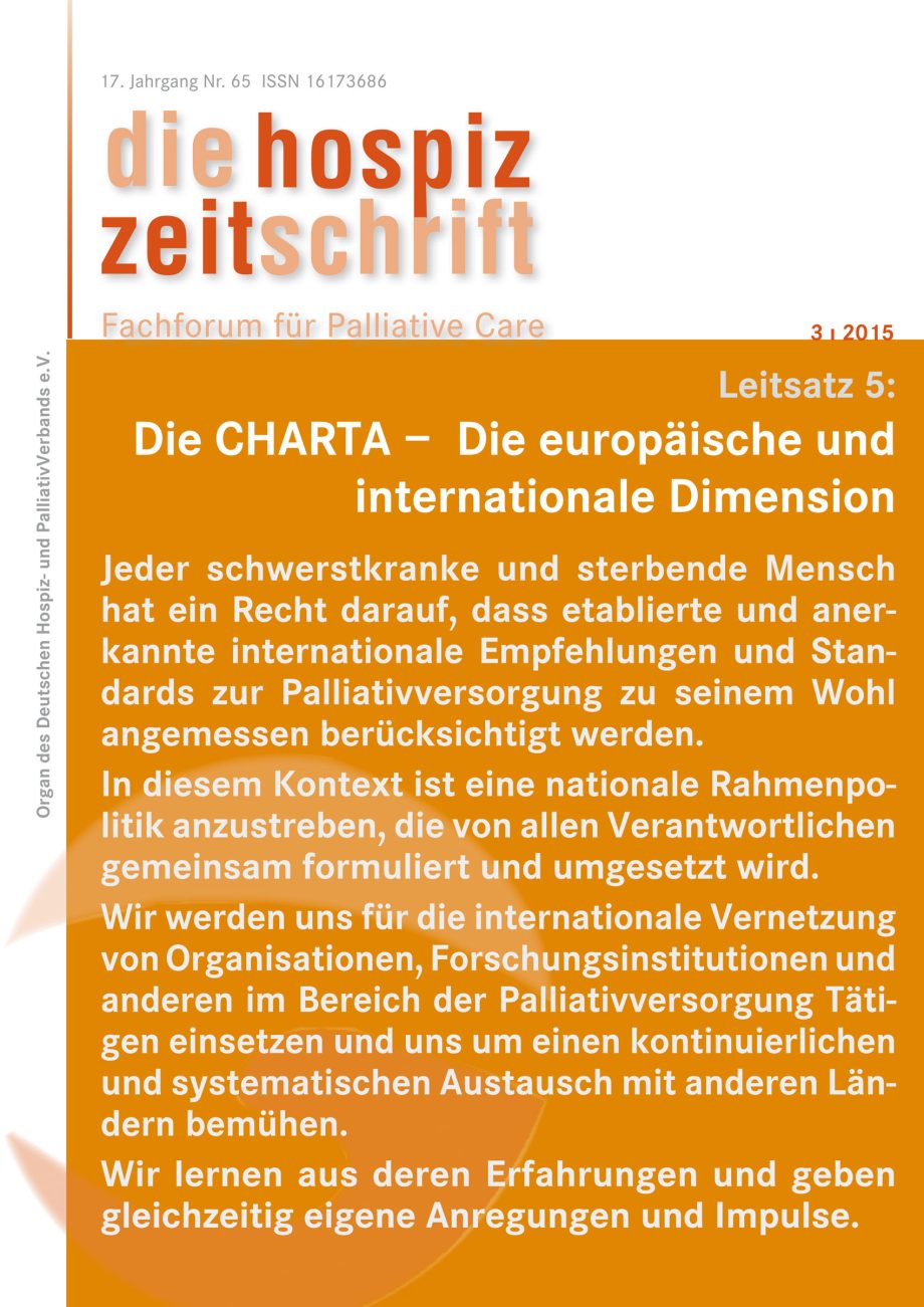 Die Unterzeichnung der Budapest Commitments 2007 auf der EAPC-Tagung gab den verbindlichen Anstoß für die Erarbeitung der Charta zur Betreuung schwer kranker und sterbender Menschen in Deutschland. Die Ergebnisse entstanden in kleinteiligen Arbeitsschritten und sind eine Kulturleistung des schöpferischen Geistes der Vertreter des Runden Tisches unter Steuerung von DHPV, DGP und BÄK. Die vorliegende Ausgabe der Zeitschrift widmet sich dem letzten Leitsatz der Charta („die europäische und internationale Dimension“)und schließt damit den Kreis zur internationalen Budapester Verpflichtung.