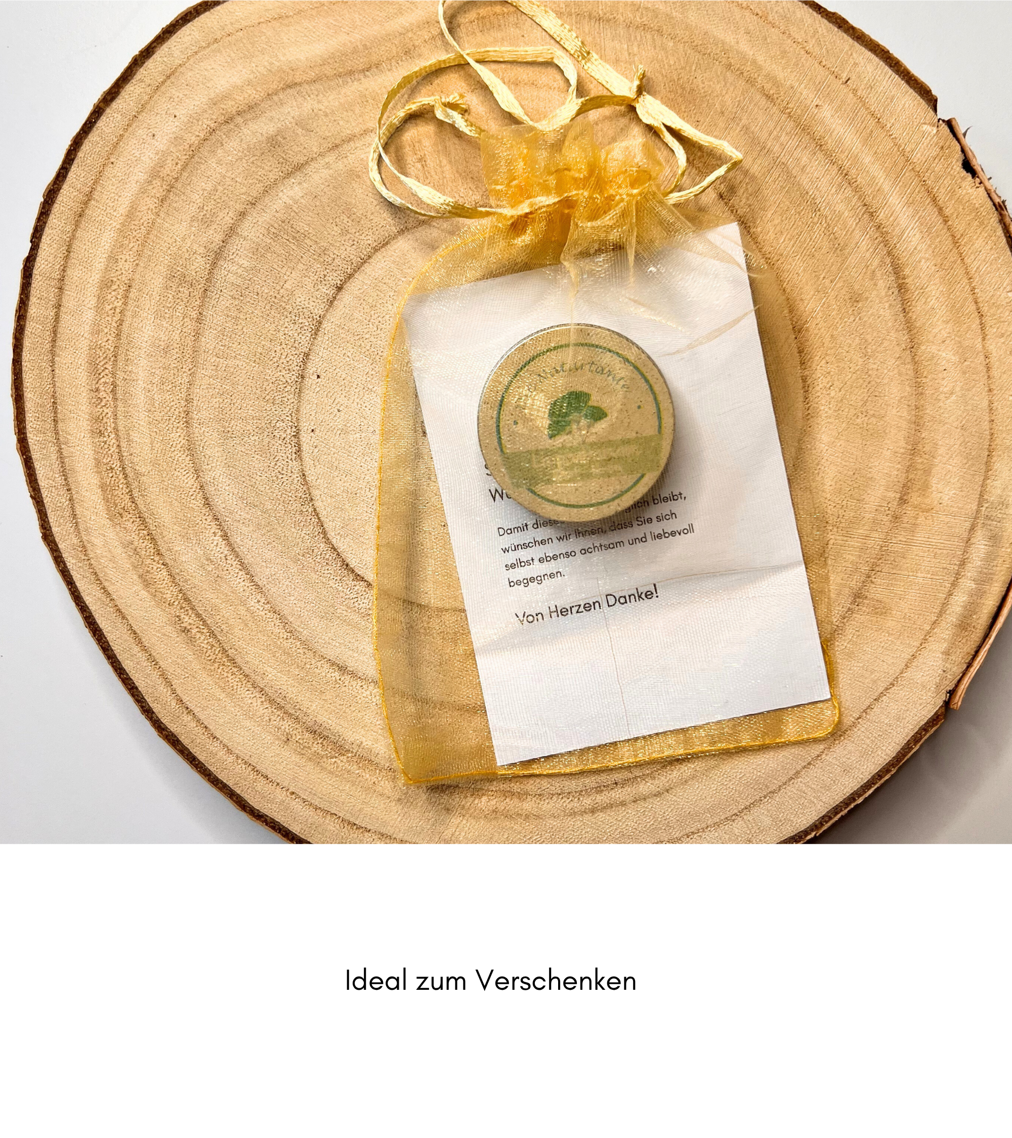 Ob für Mitarbeiter*innen, Ehrenamtliche oder Wegbegleiter im Hospiz: Ein liebevolles Dankeschön, das Achtsamkeit und Wertschätzung ausdrückt. Der Lippenbalsam ist einzeln, im praktischen 10er-Set oder in einem Organzasäckchen erhältlich – ideal als kleine Aufmerksamkeit zu Weihnachten oder zwischendurch.
